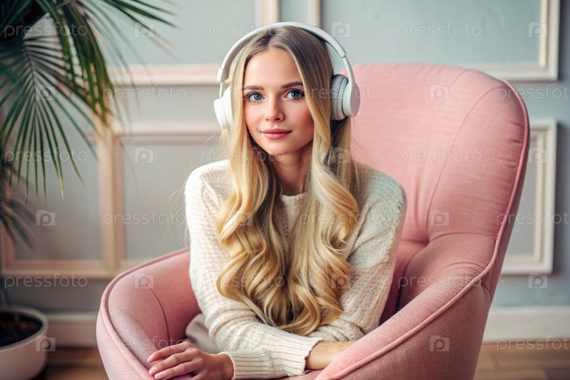 Молодая красивая блондинка слушает музыку в больших беспроводных наушниках дома, на стуле в гостиной