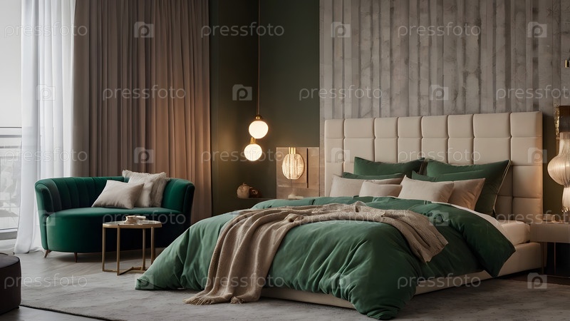 Интерьер современного дома.Минималистский уютный интерьер спальни с головкой, постельным бельем, подушками и ночным столом