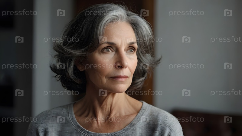 Минимализм - студийный портрет естественно стареющей, элегантной седой пожилой женщины в интерьере и одежде спокойных тонов