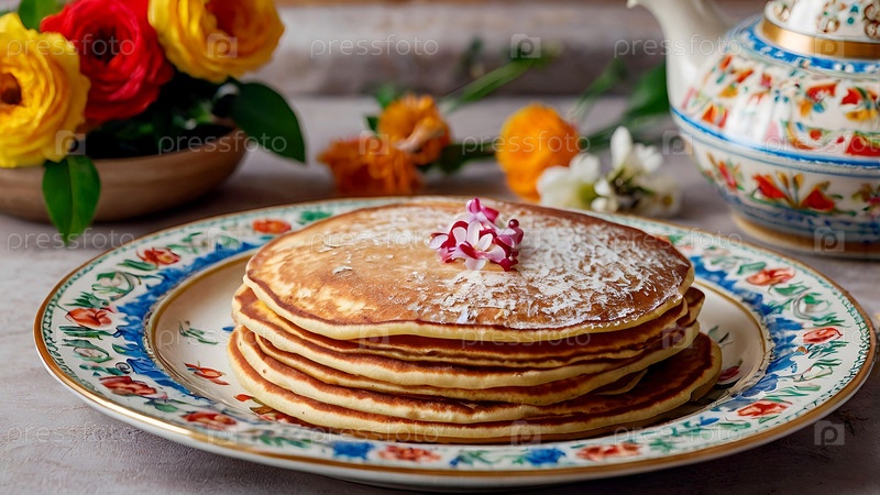 Традиционные российские блины выложены на декоративной плите на фоне яркой керамики и весенних цветов