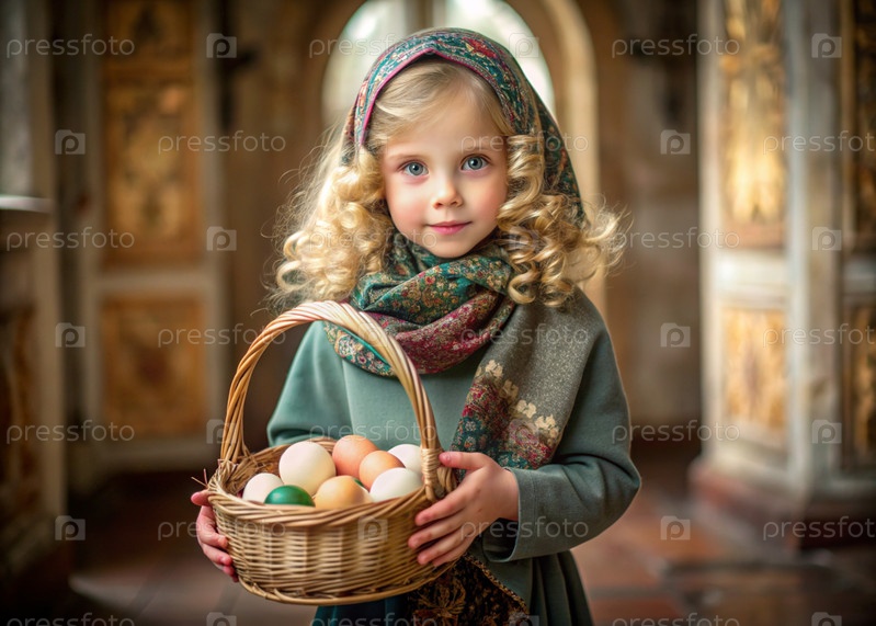 Счастливая Пасха. Христианство. Портрет трехлетней девочки в русском народном шале с плетеновой корзиной с пасхальными яйцами в руках на фоне православного храма