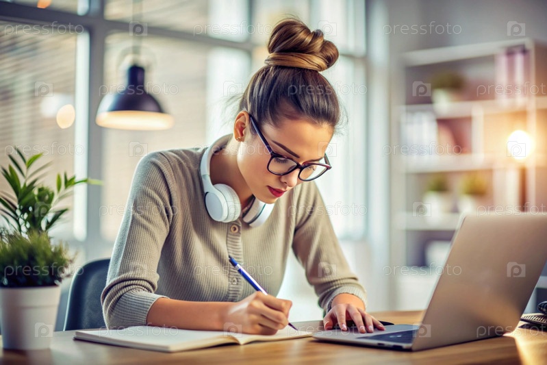 Молодая женщина фрилансер в очках и наушниках работает на ноутбуке или делает покупки в интернет-магазине
