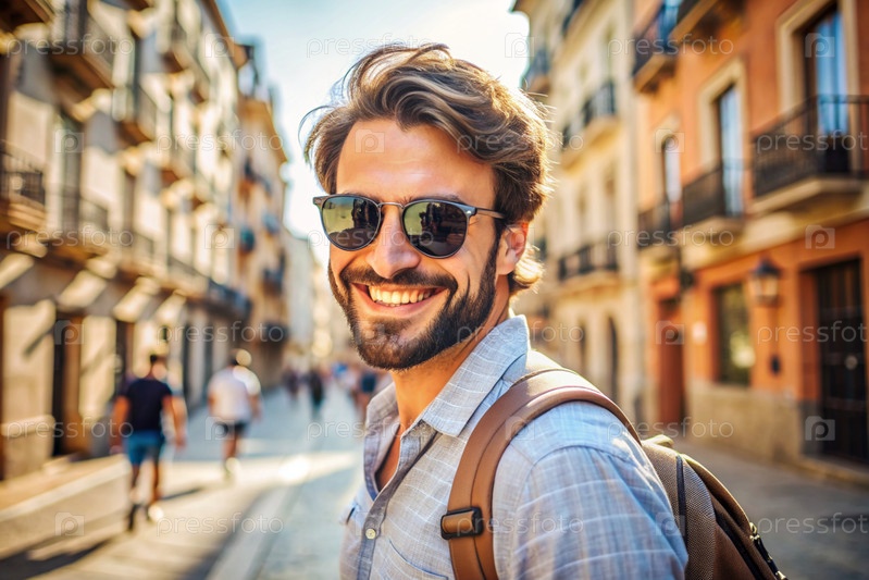 Портрет счастливого красивого хипстера-путешественника с рюкзаком и солнцезащитными очками. Сольное путешествие, образ жизни. Молодой турист наслаждается отдыхом в солнечный день