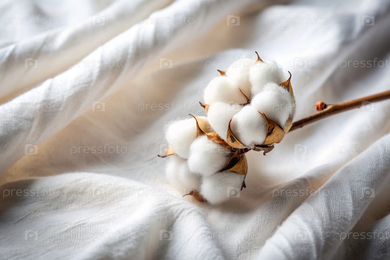 Текстильная промышленность. Хлопок. Хлопковый цветок на фоне белого хлопкового ткани. Место для текста