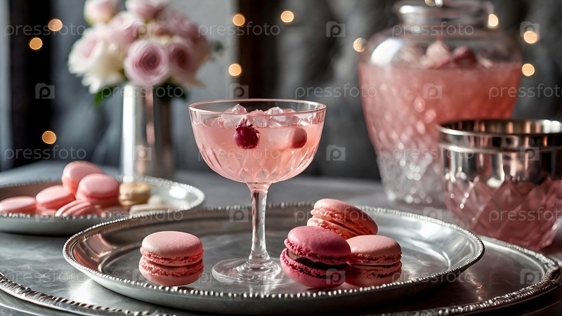 Элегантные мягкие розовые коктейли с льдом и морозом в винтажных бокалах на серебряном подносе с вишней и макаронами
