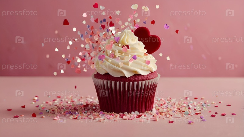 Проветриваемый красный бархатный кексы с сливочным сыром и сердцами, окруженными сахарной ленточкой на тёплом розовом фоне ко Дню святого Валентина и 8 марта