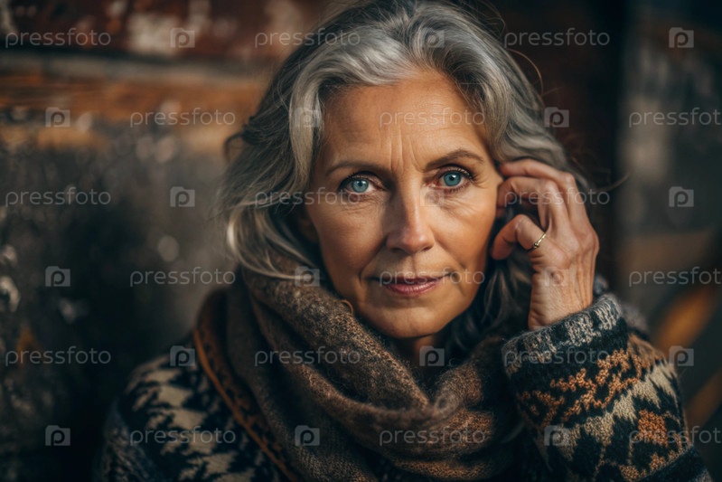 Осенний портрет красивой пожилой женщины, пенсионерки 70 лет. Она носит шарф с этническим узором и теплый свитер. Концепция жизни пожилых людей
