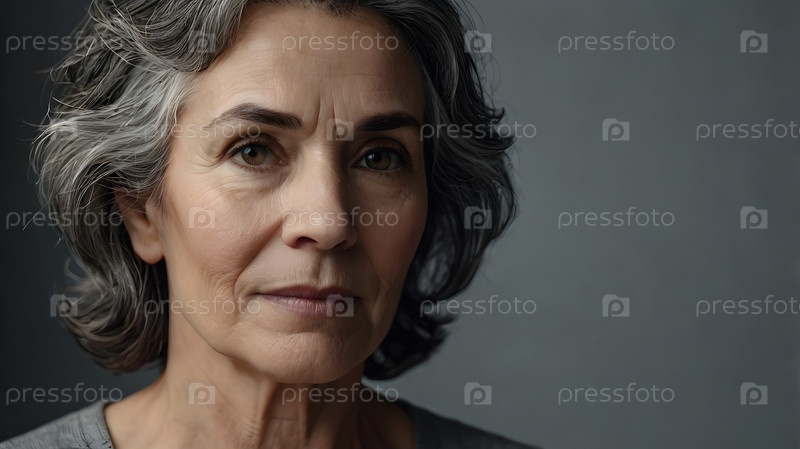 Минимализм - студийный портрет естественно стареющей, элегантной седой пожилой женщины в интерьере и одежде спокойных тонов