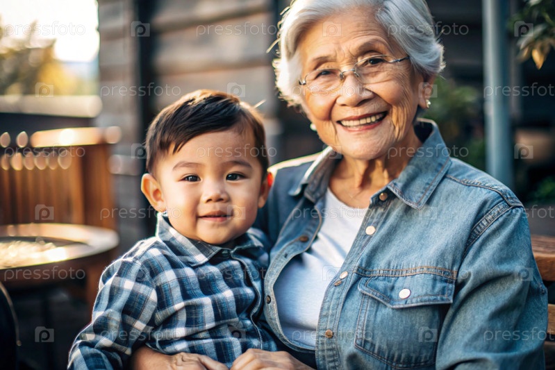 Счастливая семья, ребенок и бабушка обнимаются на улице в парке, счастливы и довольны