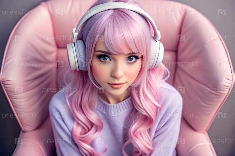 Молодая красивая японская девушка с розовыми волосами в аниме слушает музыку на беспроводных наушниках в кресле