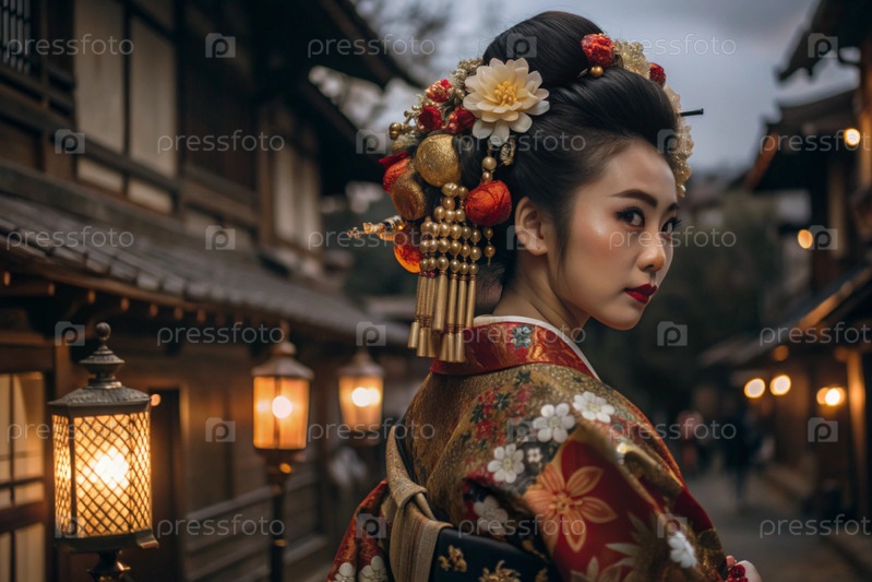Японская девушка в традиционном национальном костюме - кимоно. На фоне домов, фонарей и вишневых деревьев портрет символизирует традиции и культуру народа Японии