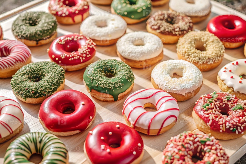 Вкусный десерт. больная коробка различных пончиков с красочными посыпаниями на столе. кондитерские изделия