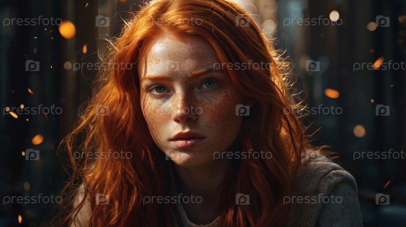Портрет красивой рыжеволосой девушки с кудрявыми волосами и веснушками на лице в солнечном свете