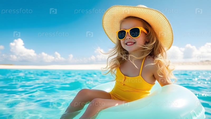 Красивая маленькая кудрявая девочка в соломенной шляпе и желтом купальнике на надувном круге в море.Концепция отдыха с детьми, туризма и летних каникул у воды