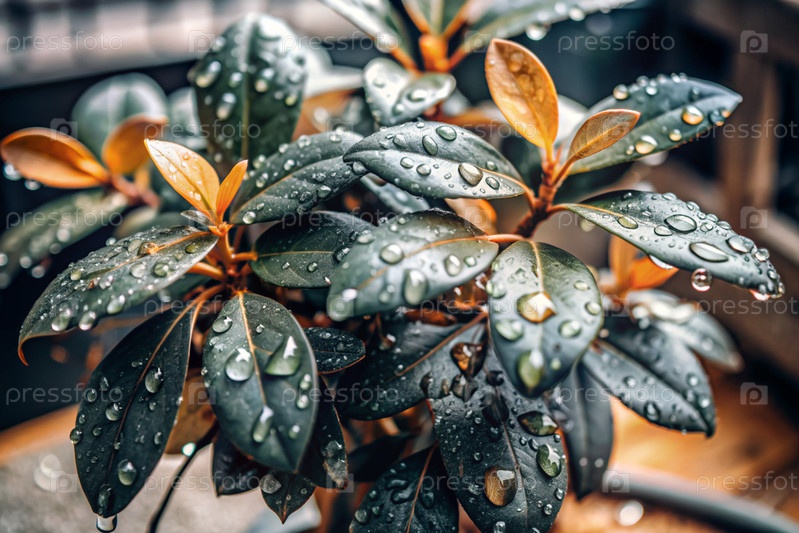 Макрографический крупный план красно-зеленых листьев, капли воды на листьях