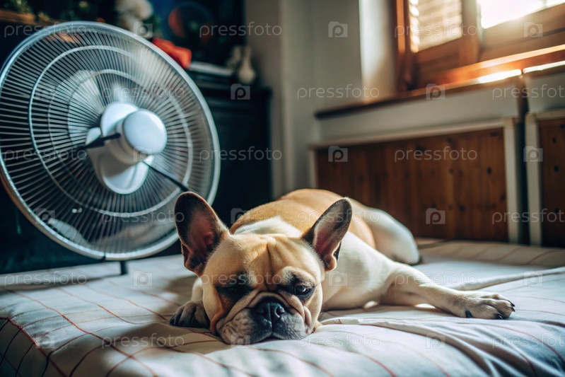 Уставший щенк Бульдог спит перед фанатами в спальне в очень жаркий летний день