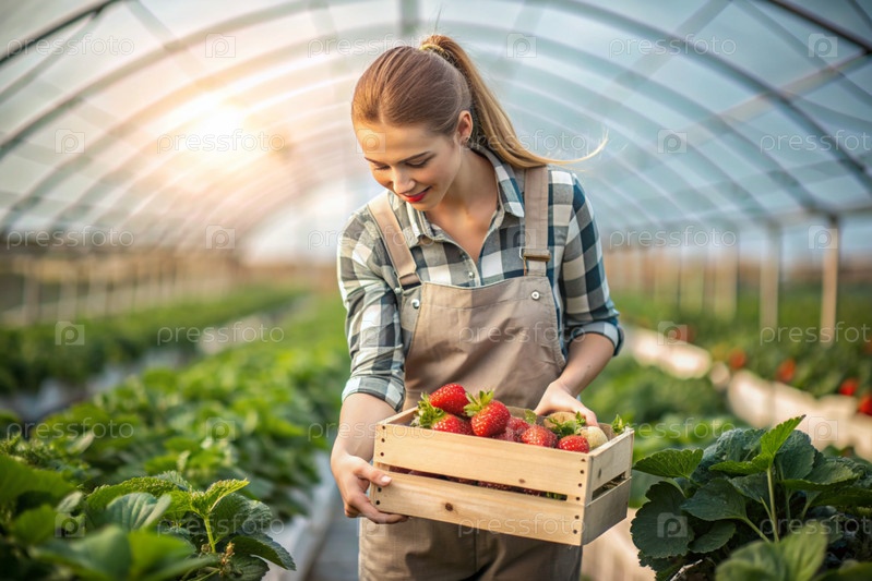 Сельскохозяйственная промышленность. деревянный ящик со клубниками в руках фермерской девушки. садовник собирает богатый урожай в теплице