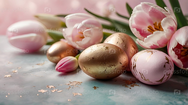 Нежные пасхальные яйца в розовых, золотых и фиолетовых тонах и цветы тюльпанов на пастельном акварельном фоне с деликатными венами