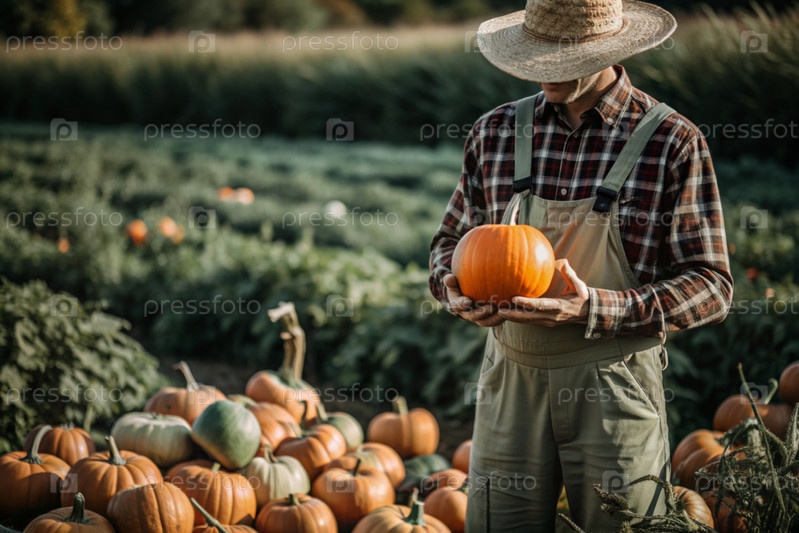 Руки мужчины в квадратной рубашке с тыквенным крупным планом и красивым осенним рисунком. Сбор тыков. Концепция празднования Дня благодарения и Хэллоуина