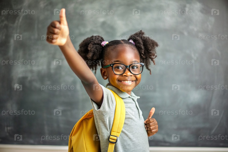 Милая чернокожая афроамериканка с очками показывает класс рукой. Ребенок впервые идет в школу. Ребёнок со школьной сумкой и книгой. Ребёнок в классе с доской. Возвращение к школе