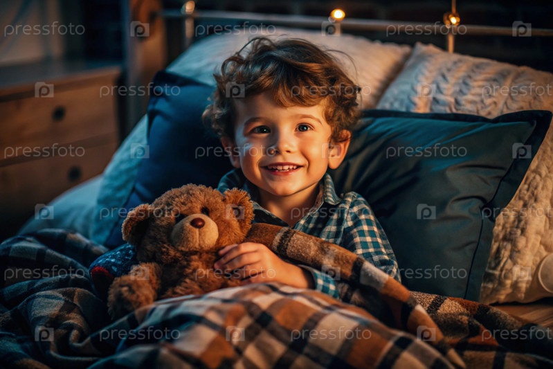 Милый мальчик обнимает плюшевого медведя, сидя в уютной кровати, маленький ребенок обнимает игрушку и готовится к постели
