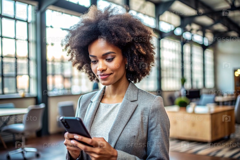Деловая чернокожая афроамериканка с кудрявыми волосами. Она одета в простую куртку. В руках смартфон. Бизнесмен смотрит на свой мобильный телефон