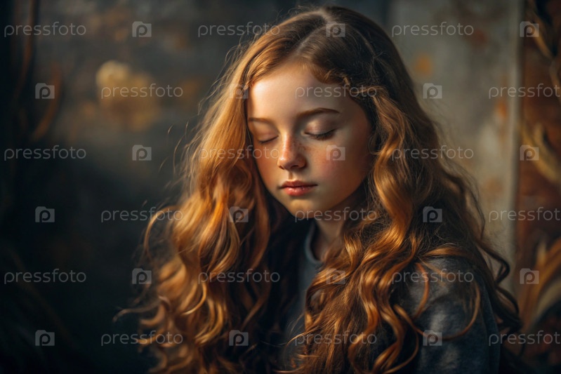 Портрет красивой маленькой рыжеволосой девочки с длинными волнистыми волосами и задумчивым взглядом.Власы развиваются и создают ощущение легкости и естественности