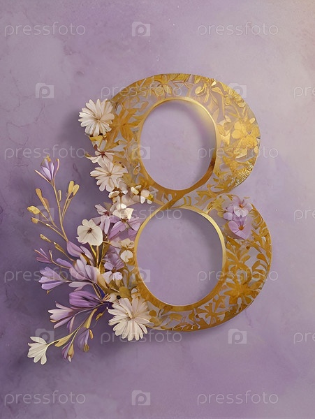 Международный женский день. праздник приходится на 8 марта. баннер, флаер. торжественный, нежный фиолетовый цветочный фон номер 8