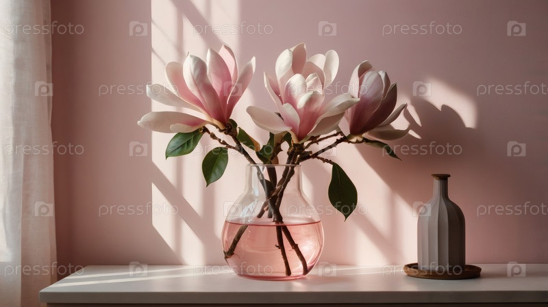 Элегантная магнолия цветет на ветке в стеклянной вазе на розовом фоне с контрастным солнечным светом. Нежные цветки с розовыми оттенками. деревенская ветка