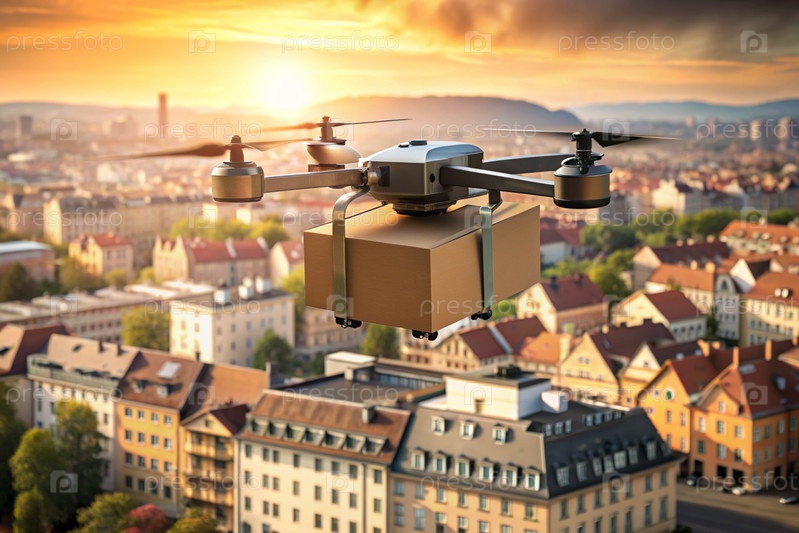 Технология будущего. Дрон доставки несет картонную коробку для человека на веревке. Дрон доставки летает между современными небоскребами. Концепция развития доставки товаров