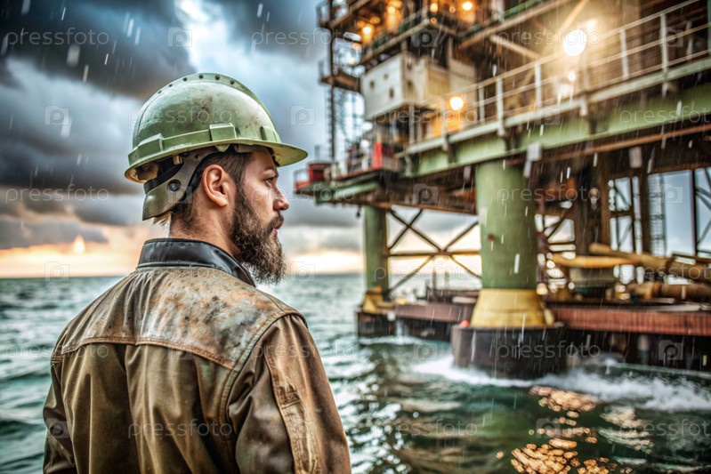 Добыча нефти. Нефтяные скважины и человек в рабочей одежде и строительном шлеме. Нефтяная платформа и промышленное оборудование. Тяжелые условия труда
