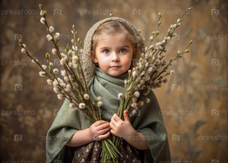 Пальмовое воскресенье. христианство. портрет трехлетней девочки в русском народном шале с ветвями ивы в руках на фоне цветущей ивы