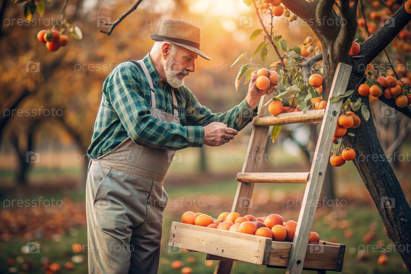 Сельскохозяйственная промышленность. Деревянный ящик с персимом в руках фермера-мужчины. Садовник собирает богатый урожай. Ближе, солнечный свет. Осенний плодовый сбор