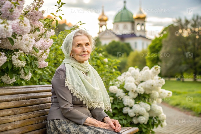 Пожилая бабушка в плато сидит на скамейке рядом с цветущим деревом перед православным храмом