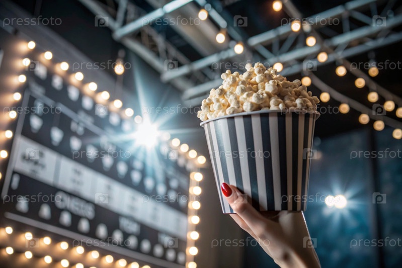 Красно-белый полосатый ящик с солеными попкорнами в руке на фоне светофоров кинотеатра