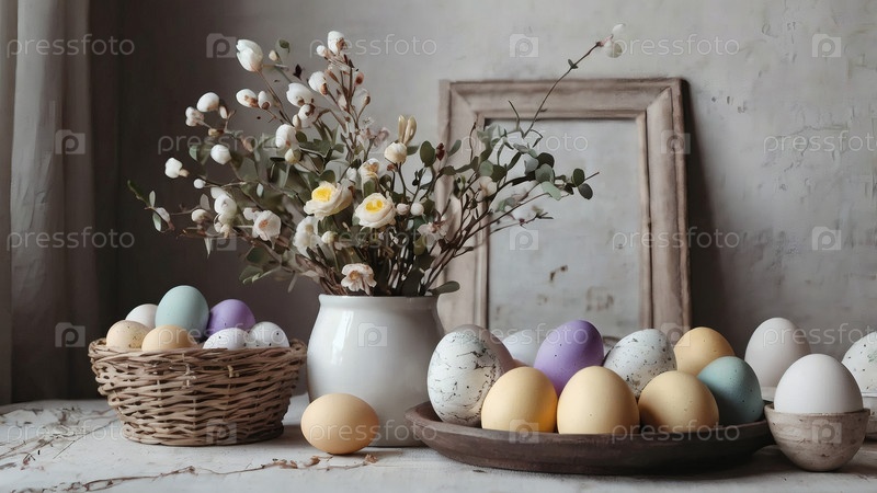 Концепция яркого пасхального праздника. Ретро интерьер дома с пасхальным декором. Весенние цветы в белой вазе и пасхальные яйца в пастельных оттенках