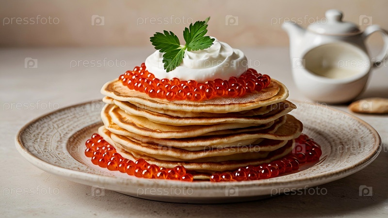 русские традиции. российский праздник Масленица. натюрморт с кучей блинов и красной икры на светло-бежевом фоне