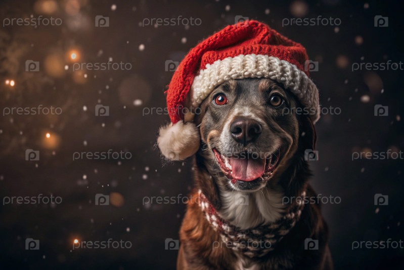 С Новым годом и счастливыми Рождествами! Падает снег. Веселая собака сидит в шляпе Санта-Клауса. Собака ждет праздника