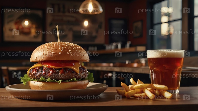 Заканчивая сочный говяжий бургер, картофель и стакан пива