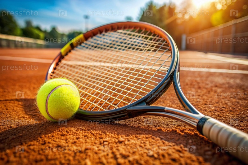 На грунтовом корте есть желтый теннисный мяч и теннисная ракетка. летний вид спорта. отличный теннис