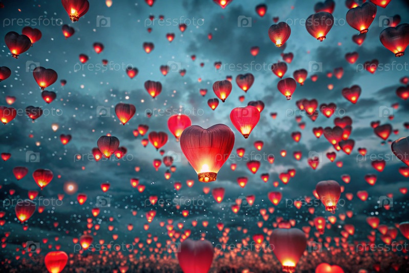 Знак на День святого Валентина Абстрактный фон Красивые, яркие красные окна в форме сердца в ночном небе