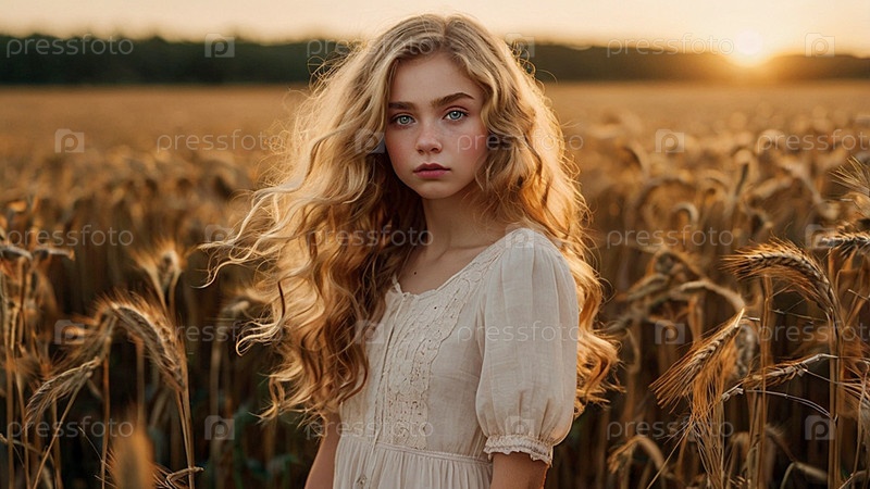 Теплый портрет красивой кудрявой женщины на пшеничном поле при закате солнца. Романтическая, спокойная и чувственная фотография девушки в деликатном платье