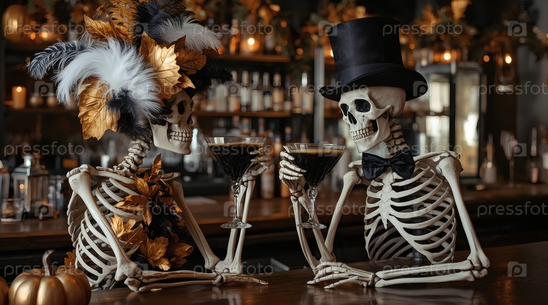 Пара любителей скелетов с коктейлями в баре.Хэллоуин или День мертвых
