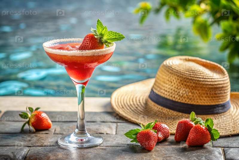 Стакан вкусной клубничной маргариты и клубничный коктейль на фоне бассейна. алкогольный коктейль сочного фруктового синего цвета с кубиками льда, ягодами и мятой