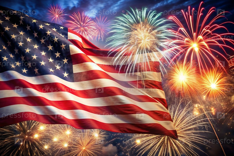 Флаг США с фейерверком в небе День независимости - 4 июля под открытым небом