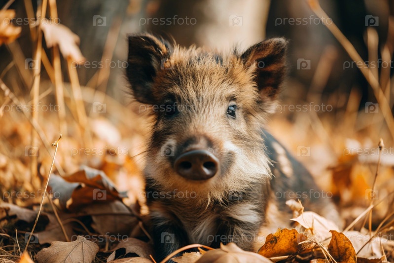 Красивый кабан, сидящий среди осеннего желтого листья.Охота на животных