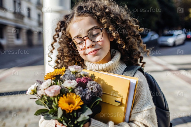 Красивая маленькая кудрявая девочка в очках и букете осенних цветов ходит в школу впервые. Ребенок со школьной сумкой, книгой и цветами. Малыш на городской улице. Возвращение к школе
