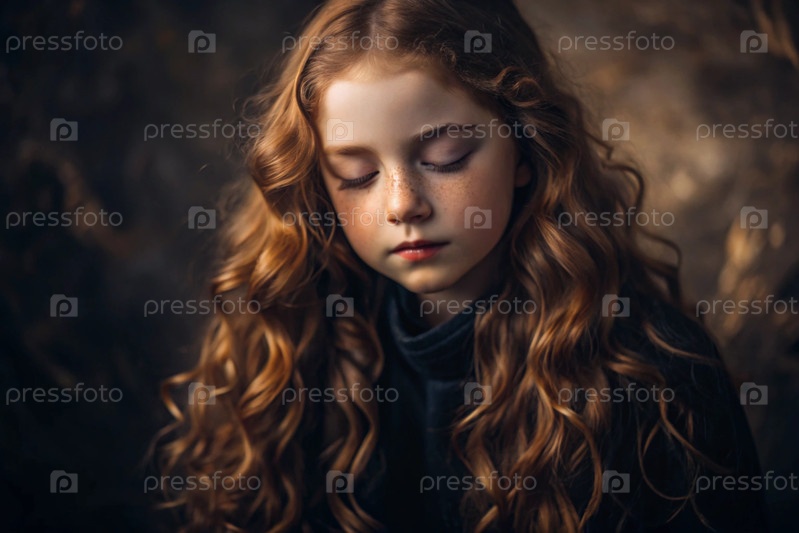 Портрет красивой маленькой рыжеволосой девочки с длинными волнистыми волосами и задумчивым взглядом.Власы развиваются и создают ощущение легкости и естественности