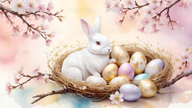 Нежные пасхальные яйца, белый кролик и вишневые ветви на фоне пастельного акварели с нежными полосками