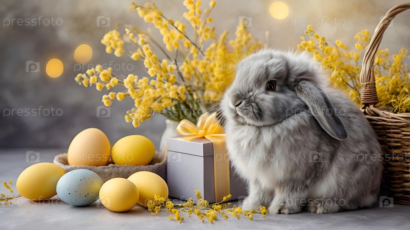 Нежные пасхальные яйца, серый кролик и цветы мимозы на пастельном акварельном фоне с нежными венами